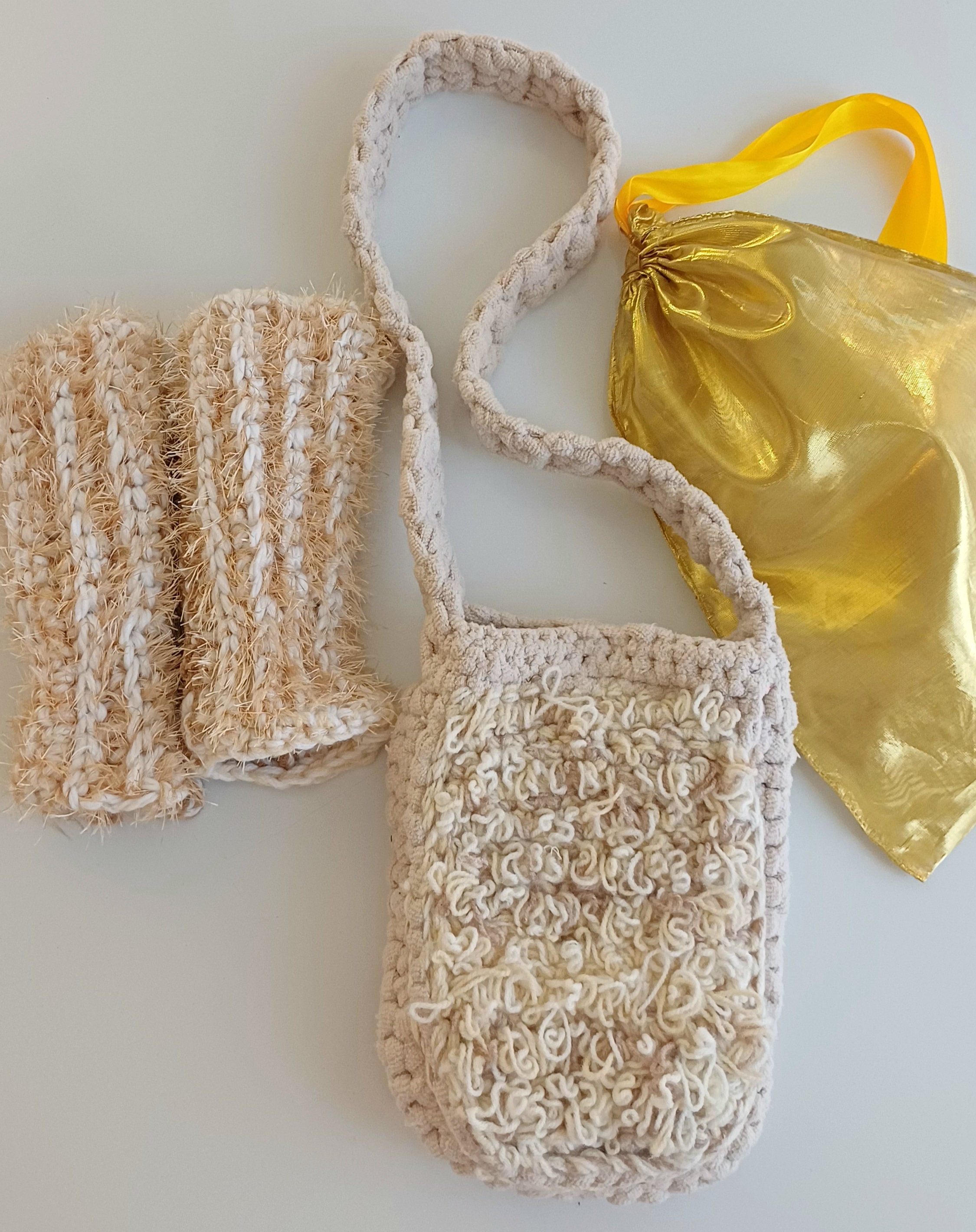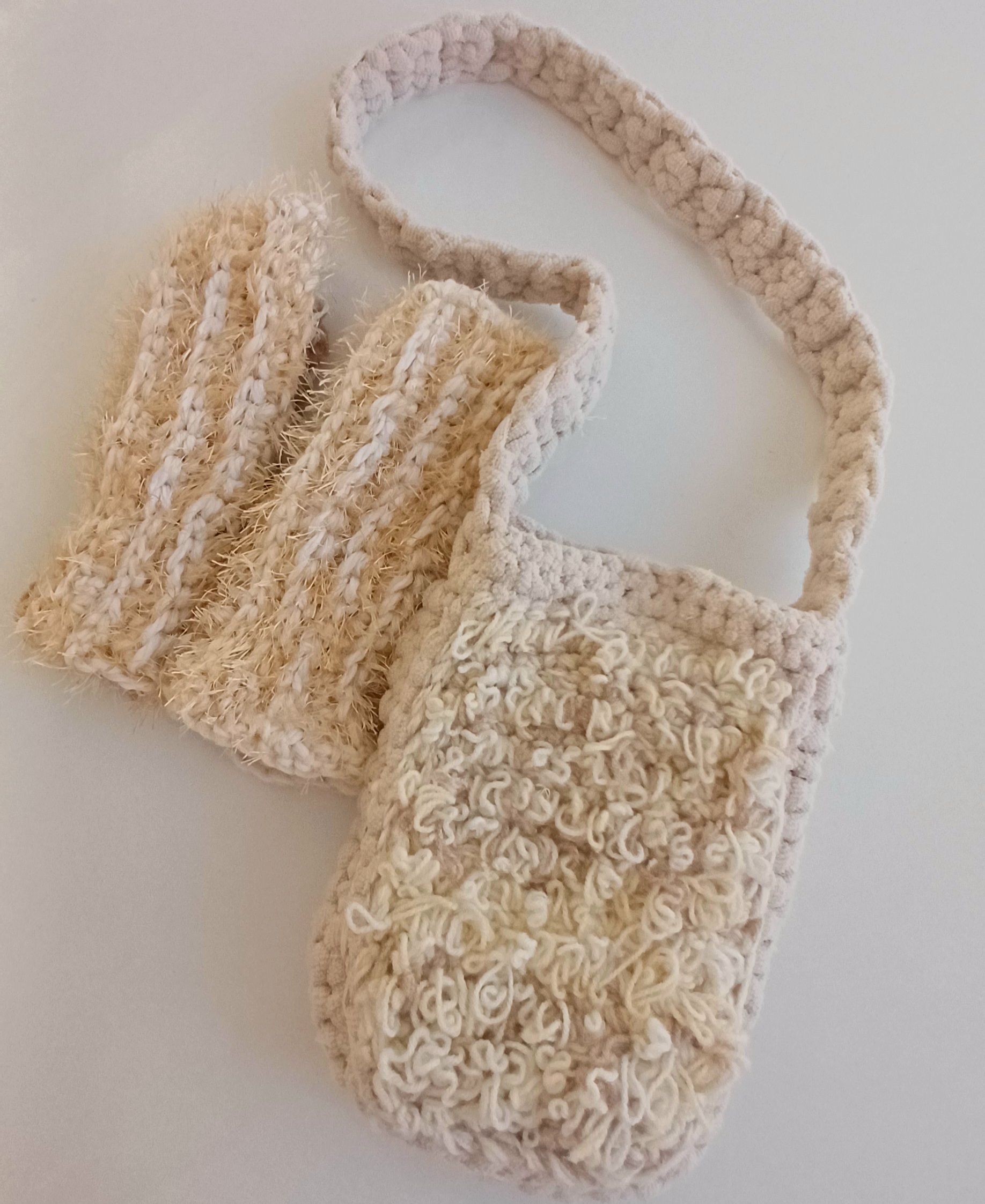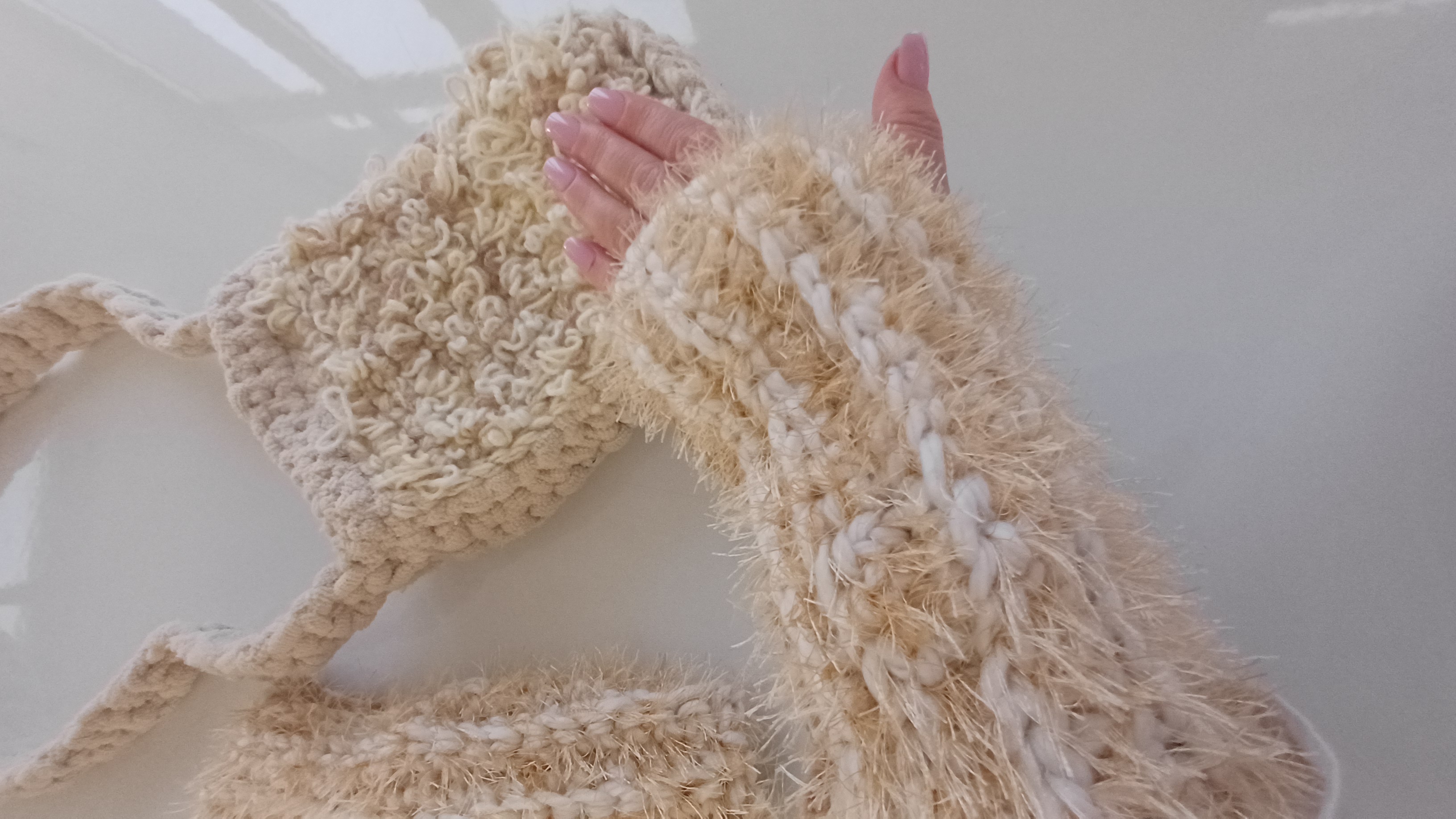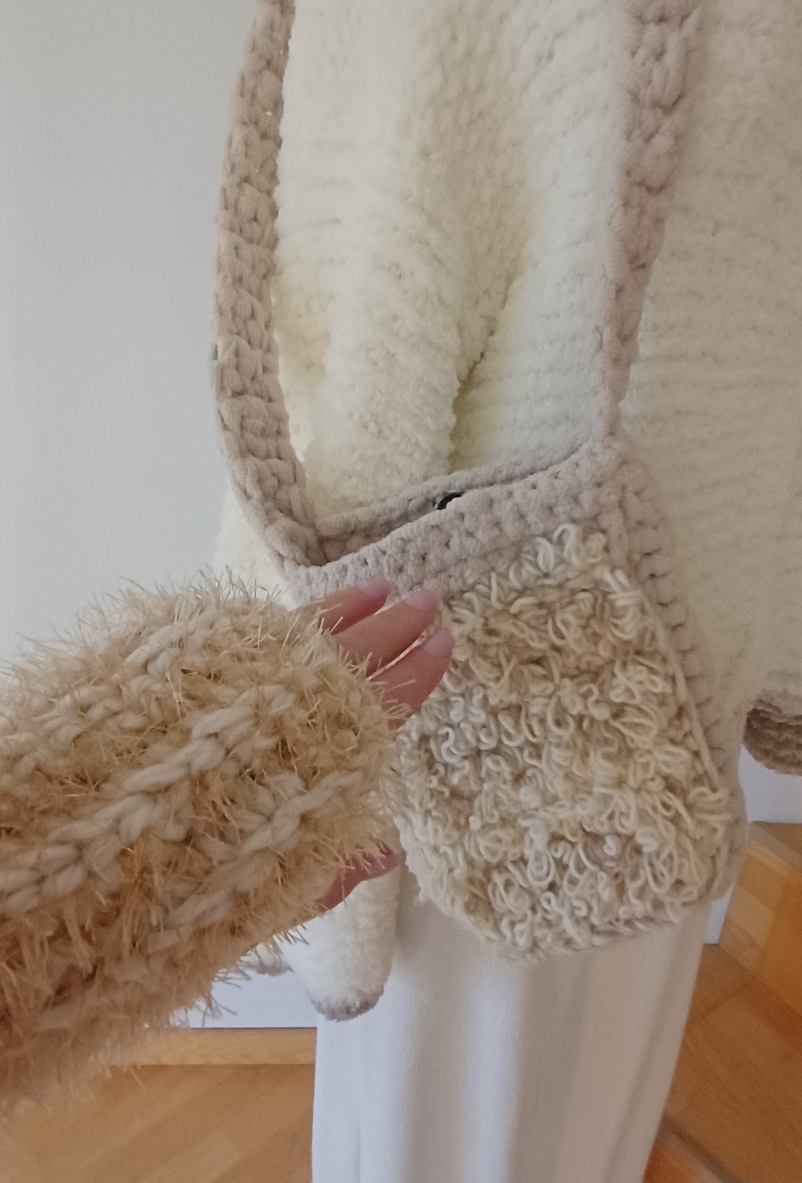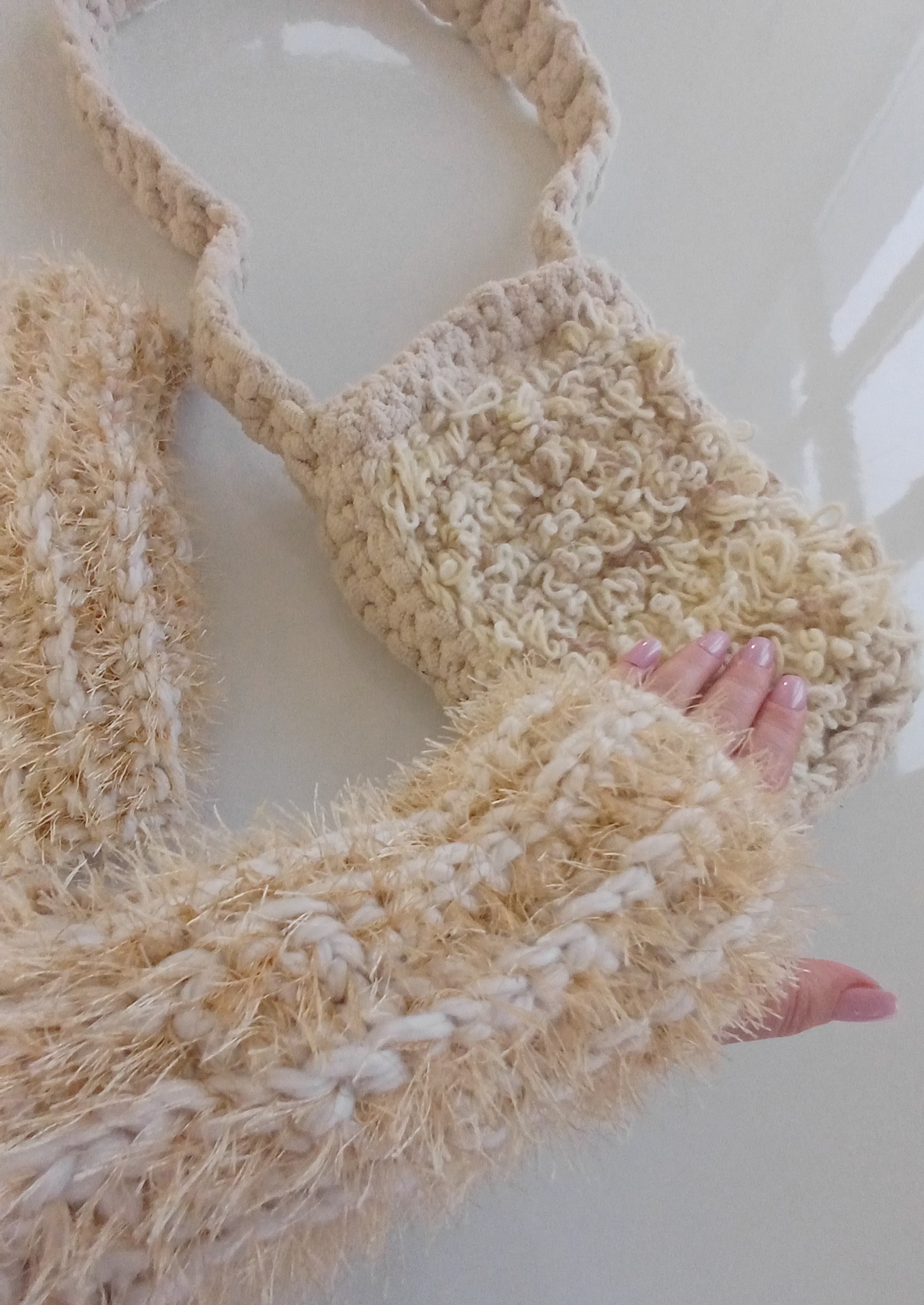 Вязаный комплект:  сумочка через плечо  и митенки - это варежки без  пальцев